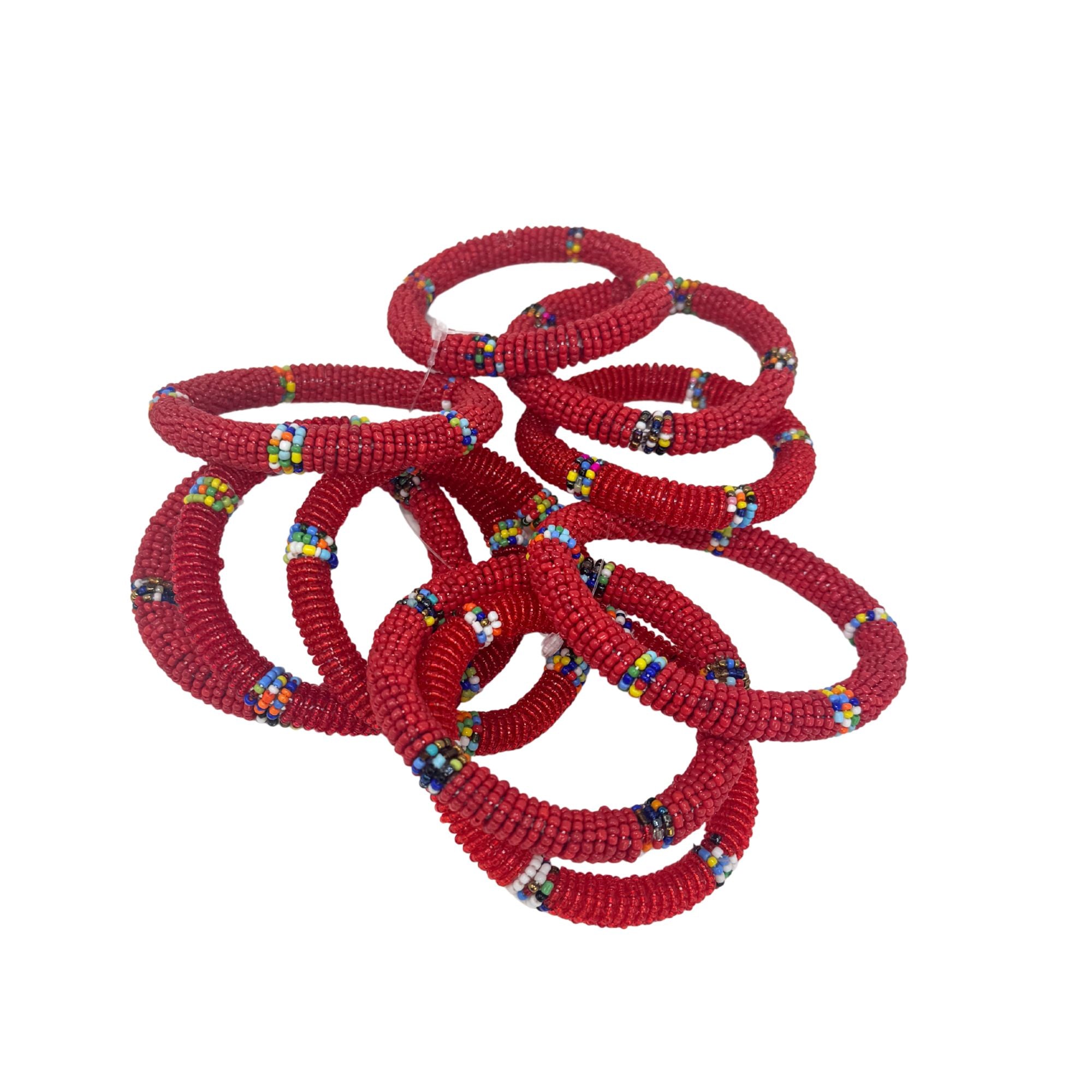 Fun to wear alone or in bunches, this Maasai bangle is a rubber ring wrapped in beads in various fun designs. The bangle gives a little to get over your hand but not too much. Each bangle is approximately 9-11 inches in circumference. Each 10 pack contains assorted designs in colors beyond the rainbow!