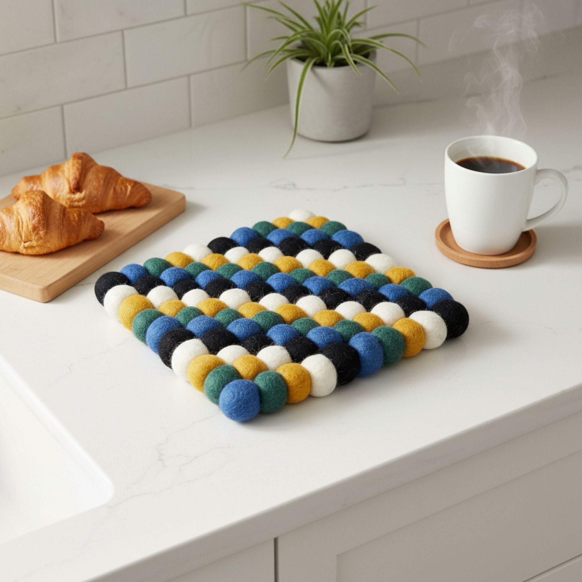 These felt trivets add texture, style, and fun pops of color while protecting your dinner table. Crafted from fine New Zealand wool and AZO-free dyes using age-old techniques. Handmade in Nepal by a Fair Trade women's cooperative.