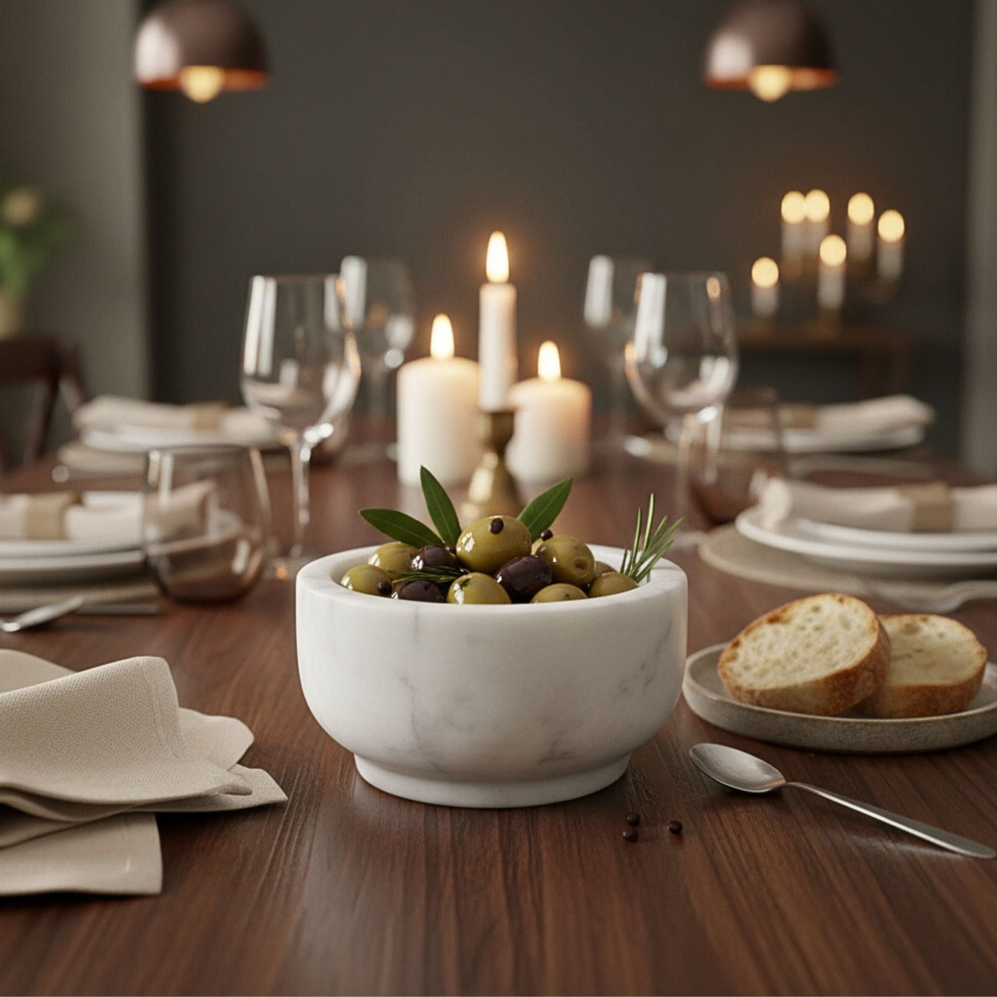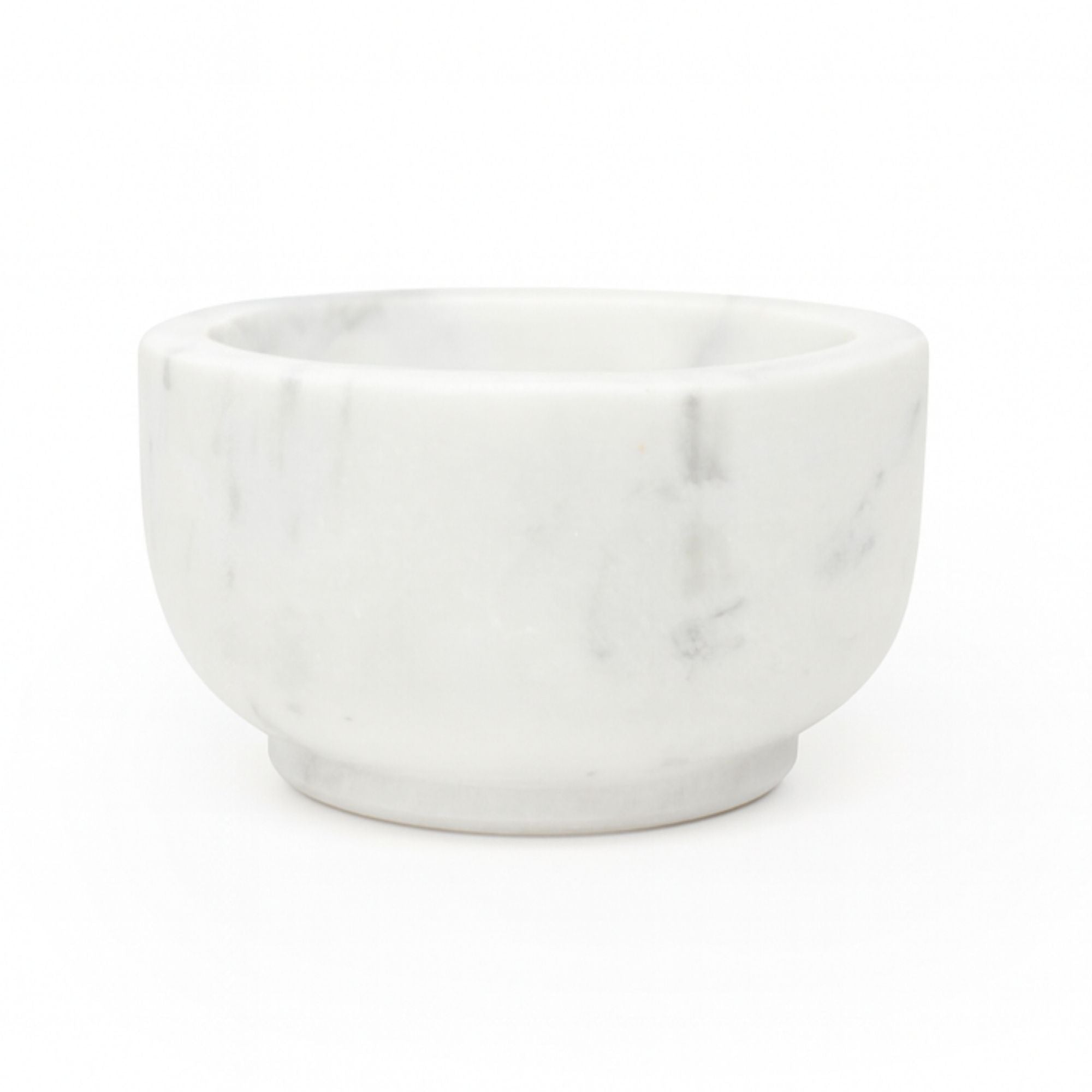 Artisans in India hand-carve and polish local marble to craft this beautiful round bowl in white marble. This versatile piece has so many uses! It is food safe and can be used in the kitchen for herbs, salt, olive or other appetizers. We also love the bowl for the bar -- great for staging cocktail garnishes. Or, it makes a great decor piece, ring holder, or sage smudge bowl. This will make a sweet and ethical gift!