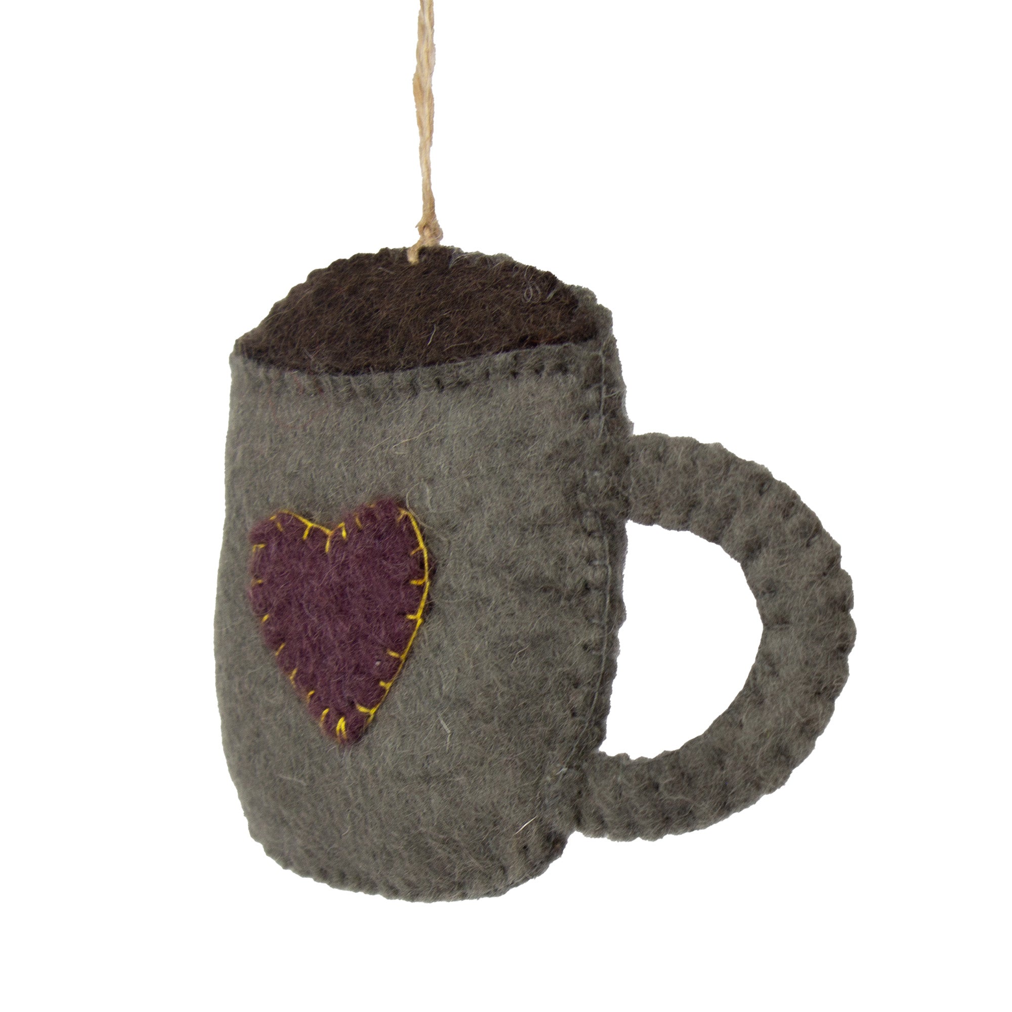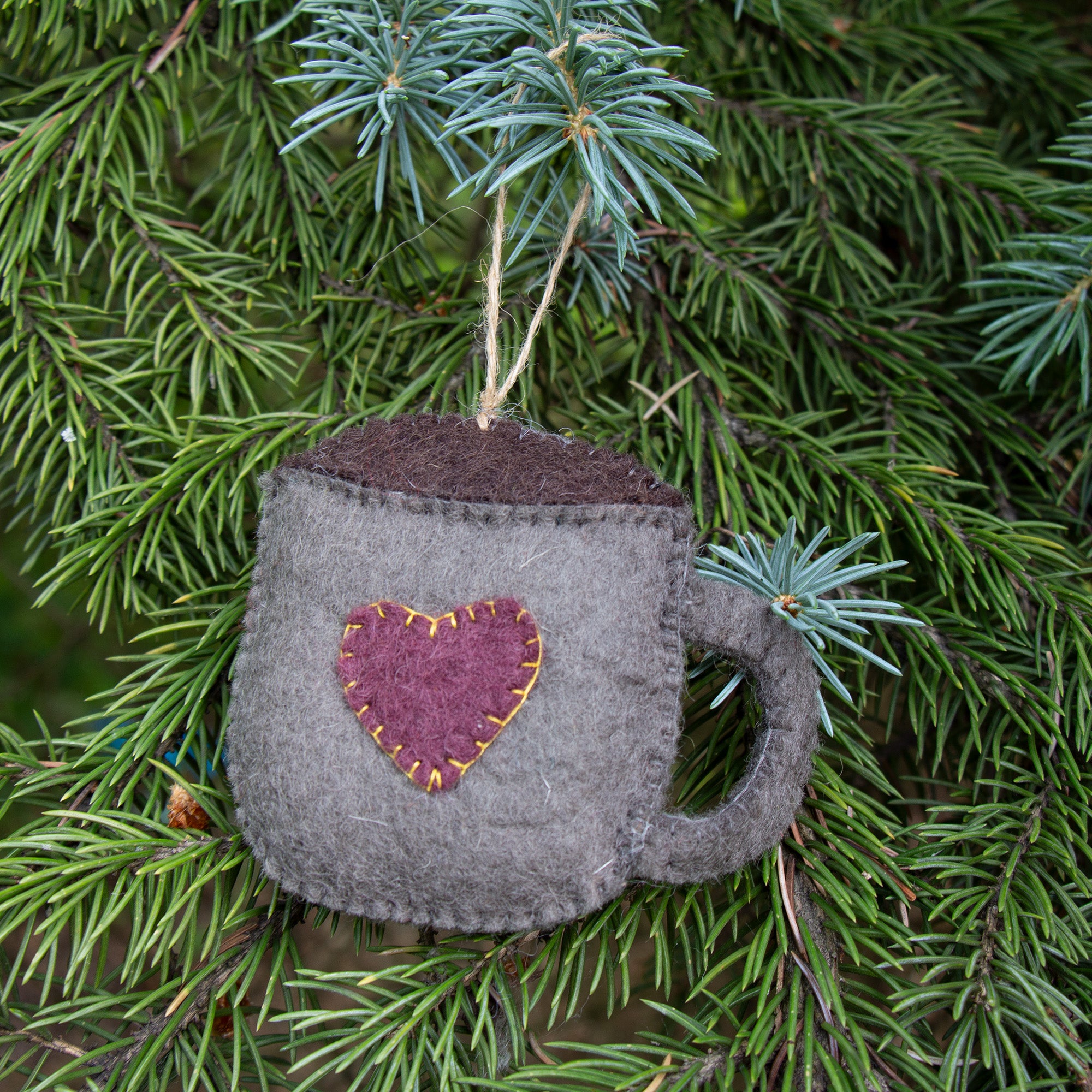 The most adorable ornament for the coffee lover! This elegant coffee pot is accented with a cute heart. The ornament is intricately detailed and lovingly crafted by mother and sister artisans in Nepal. Eco-friendly wool felt. Measures approximately 4 inches wide x 3.5-inches tall. Azo-free dyes. Fair Trade. The Art of Felting: The first step to creating these beautiful felt pieces begins with gathering some of the world’s finest sheep’s wool from New Zealand. Making felted wool is an ages-old, time-consuming process of bonding fabric with fiber. This is a physical job where the artisan’s scrub, rub, roll and rinse the wool again and again with soapy water. Once the wool is bound into a sheet and the desired thickness is complete, the felt is laid out to dry. From there, the felt wool is cut and re-worked into many complex shapes and designs. The many sheets of wool might merge several colors to create patterns and layers. This takes a well-trained, talented artisan and is a true labor of love. The end results are colorful, one-of-a-kind textiles that are stunning to behold.